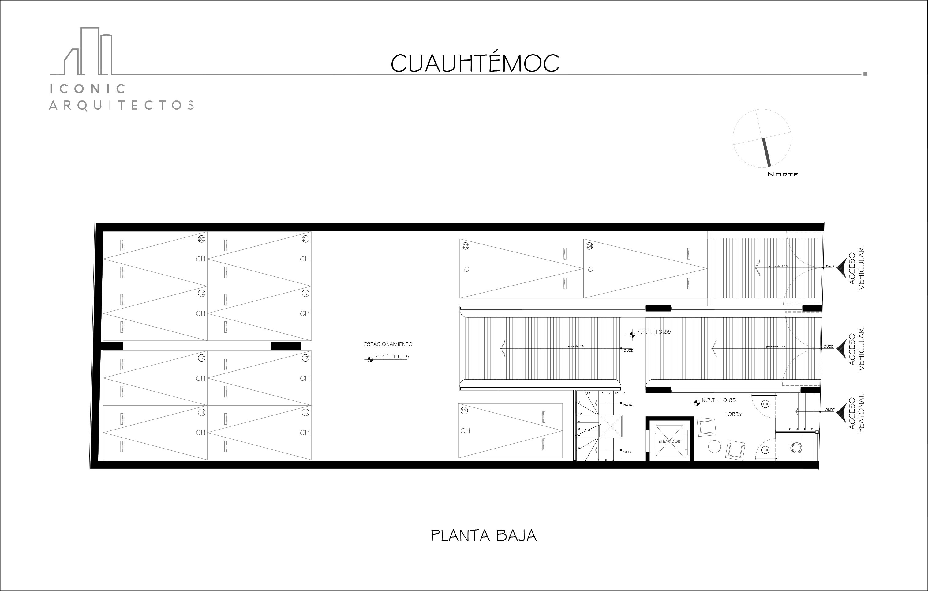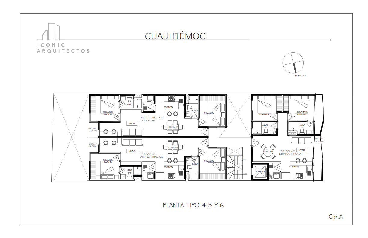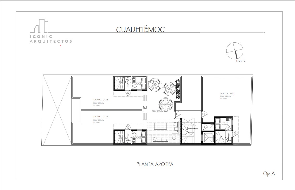 • Edificio habitacional de 21 departamentos en 7 niveles, un nivel en sótano y estacionamiento PB, con un total de 24 cajones de estacionamiento, Lobby, Roof garden comun, caseta de vigilancia con baño, accediendo sobre la calle de Cuauhtemoc.