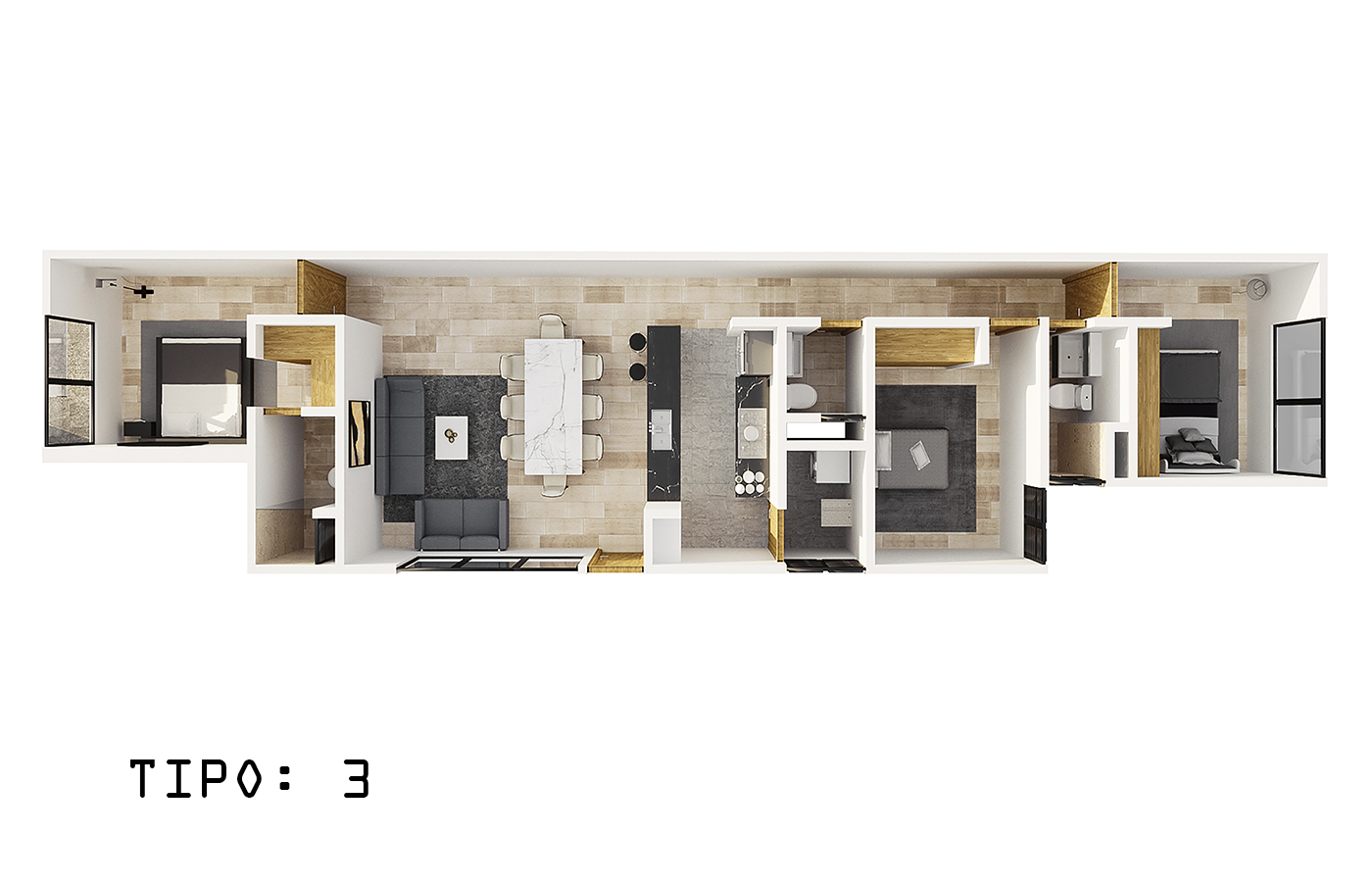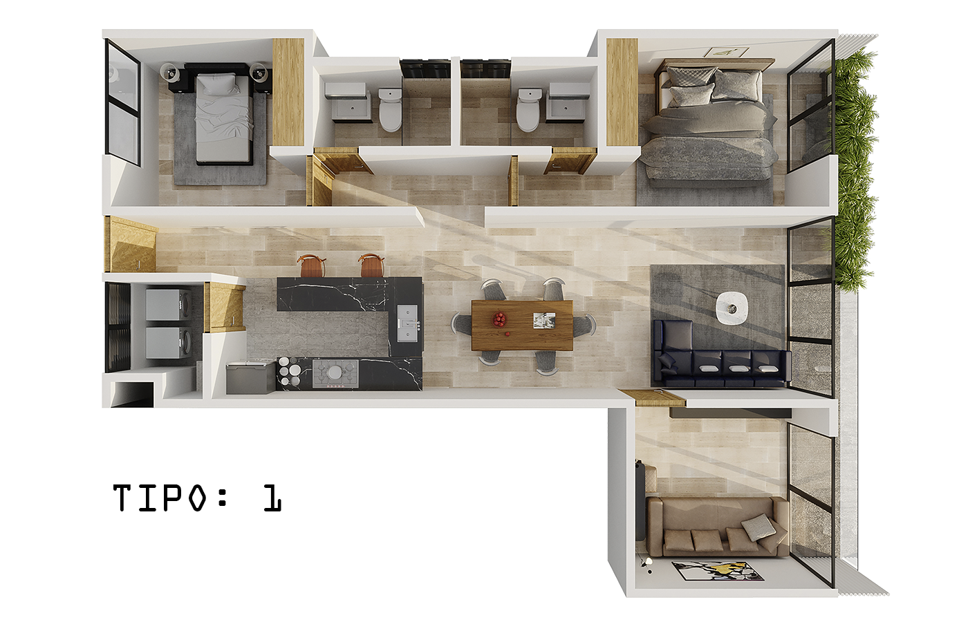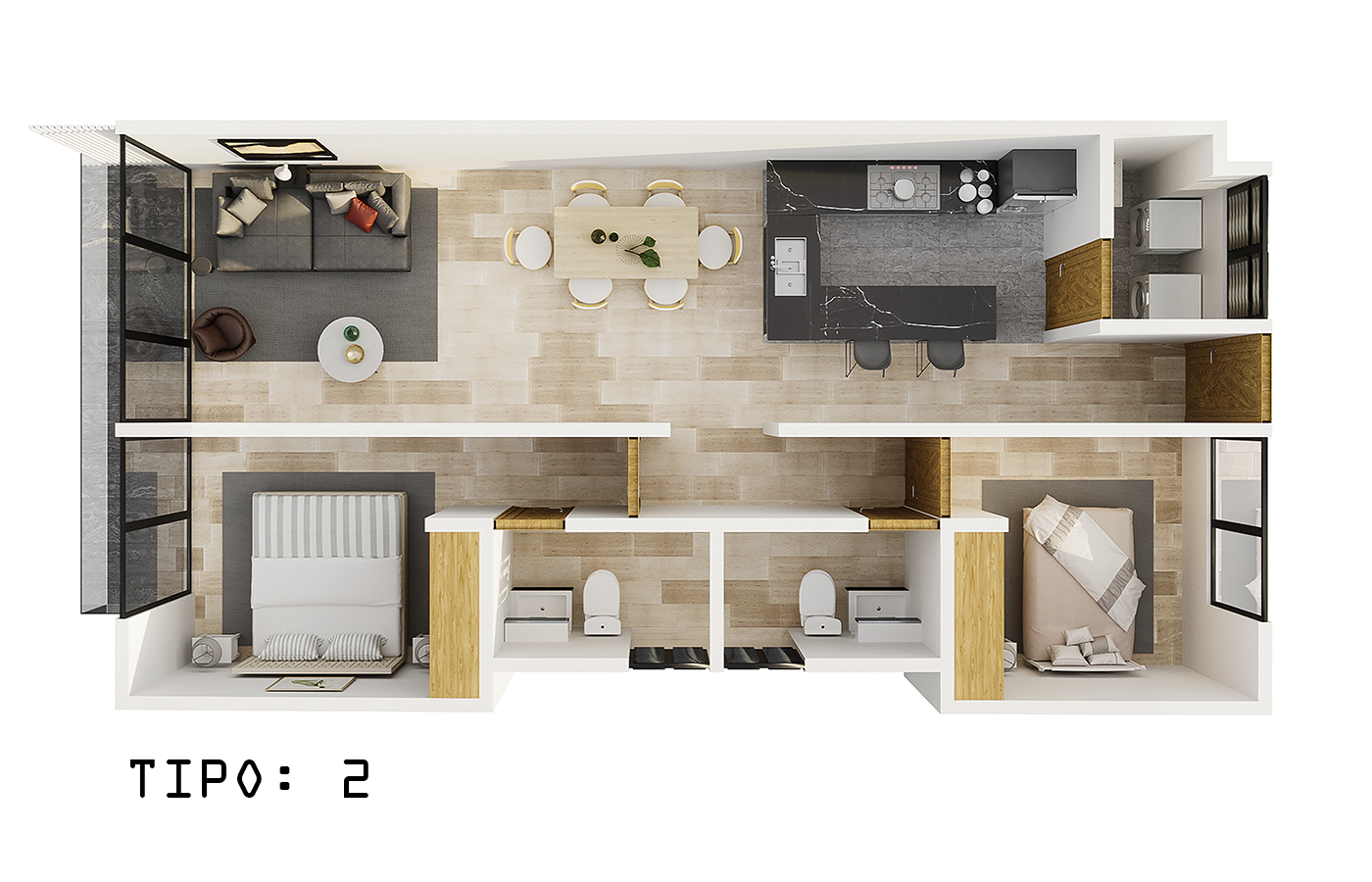 • Estancia-comedor, sala de T.V., cocineta, cuarto de lavado, recamara principal con baño, recamara 1, baño;